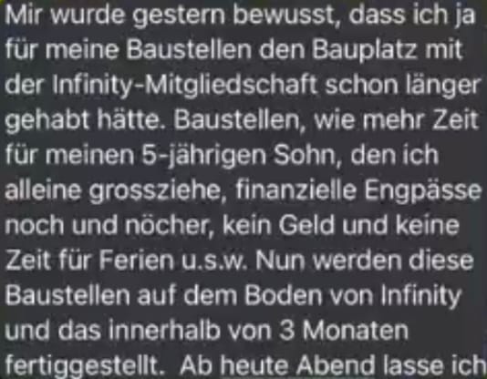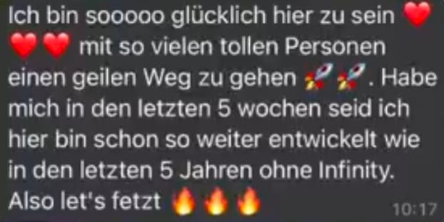 Sicherlich gibt es ein Leben ohne Infinity. Aber der Gründer, Christian Nickel, kann Dir sagen, dass er 10 Jahre brauchte, um all das Wissen anzusammeln, das er heute in der Akademie teilt. Natürlich kannst Du auch 10 Jahre mit eigener Recherche verbringen. Du kannst 1 Mio. Ausreden finden, warum Du heute nicht anfangen solltest. Oder Du machst den ersten Schritt und in 10 Jahren feiern wir DeineEntscheidung in Dubai! Du entscheidest.