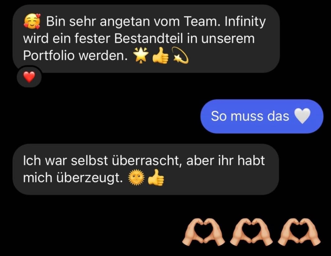 Wenn Du mit Infinity zufrieden bist und von den Ergebnisse überzeugt bist, kannst Du Infinity weiterempfehlen und erhälst eine Provision, die mit der Größe deines Teams zunimmt!