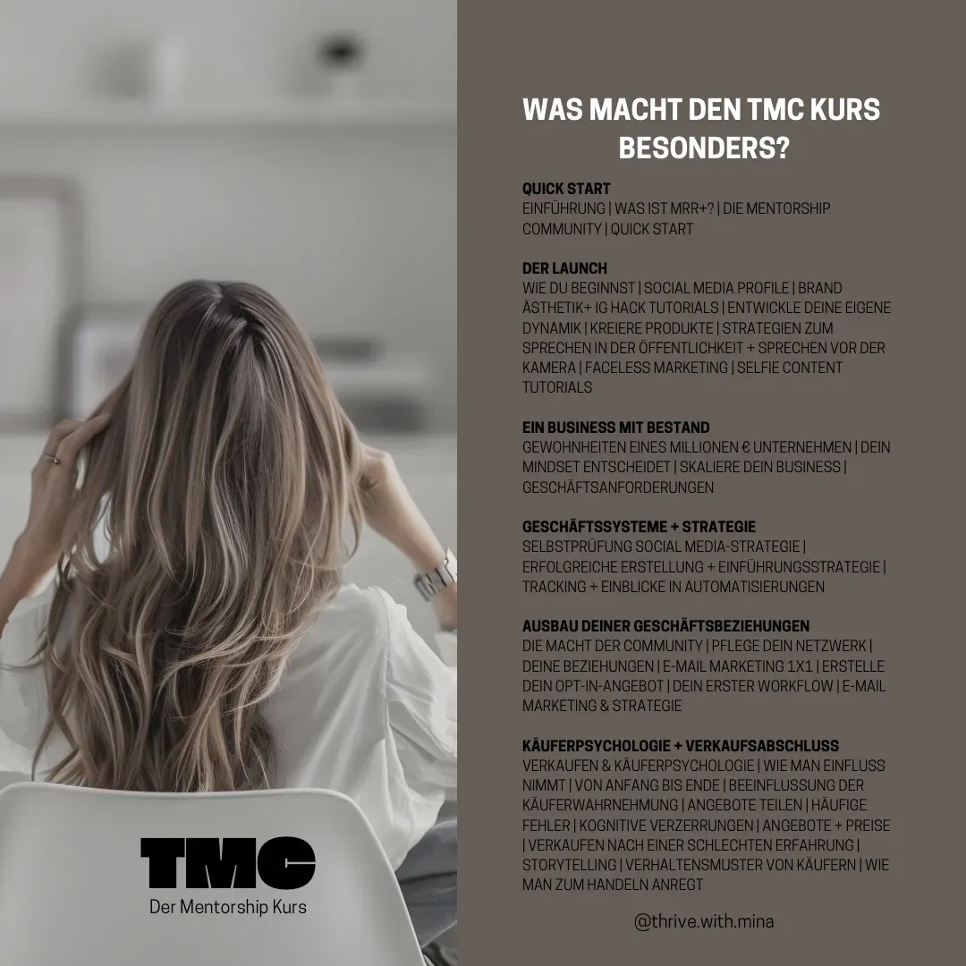 Mit TMC erhältst du umfassendes Mentoring und strategisches Wissen, um dein Online-Business profitabel und nachhaltig zu gestalten. Der Kurs richtet sich an Einsteiger und erfahrene Unternehmer, die: